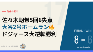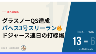 初回のテオスカー2号2ランHR(WPA+18.2%)でいきなり主導権を掌握したドジャースが、その後も手を緩めず17安打で14点を叩き出した。大谷3号ソロHR(107.8mph・414ft)。