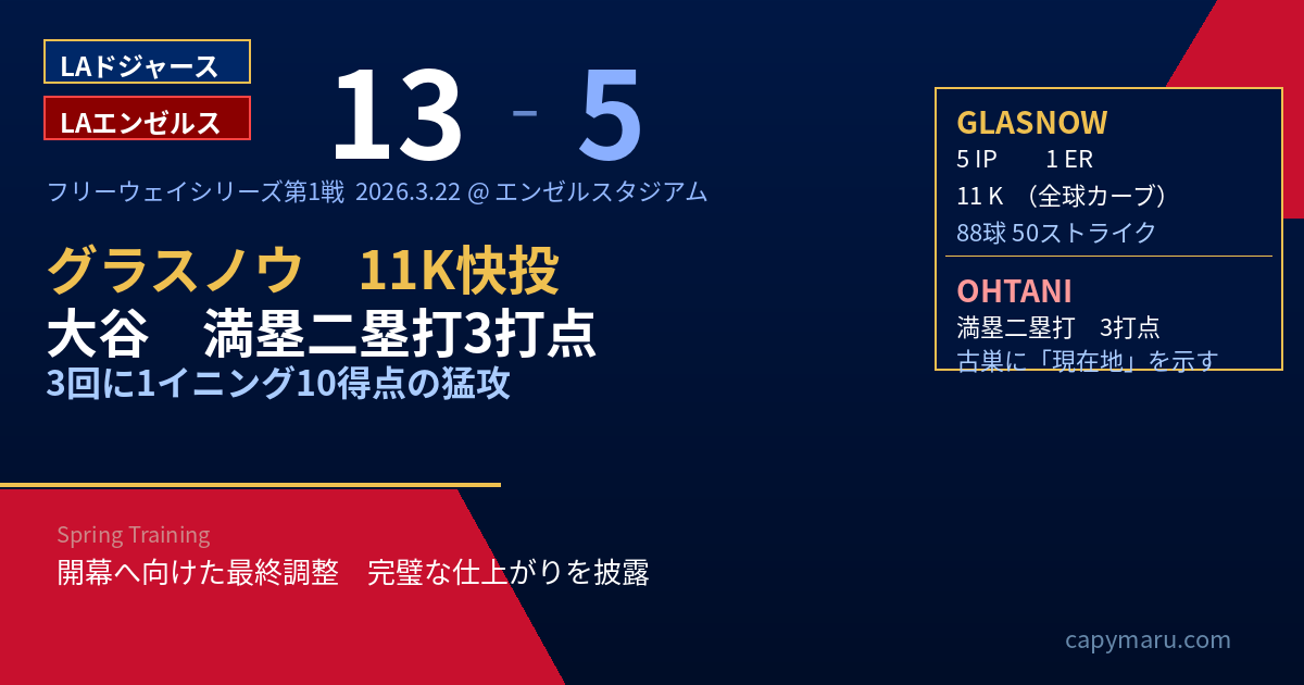2026年3月22日(現地時間)、アナハイムのエンゼルスタジアムでフリーウェイシリーズ第1戦が行われ、ドジャースが13-5でエンゼルスを撃破しました。開幕前最後の実戦でタイラー・グラスノーが88球5回11奪三振の快投を披露。3回表には大谷翔平の走者一掃二塁打を含む1イニング10得点という猛攻で早々に試合を決めました。プレシーズン最後の試合にふさわしい圧巻のパフォーマンスで、開幕への期待が一気に高まっています。