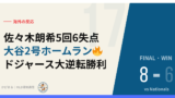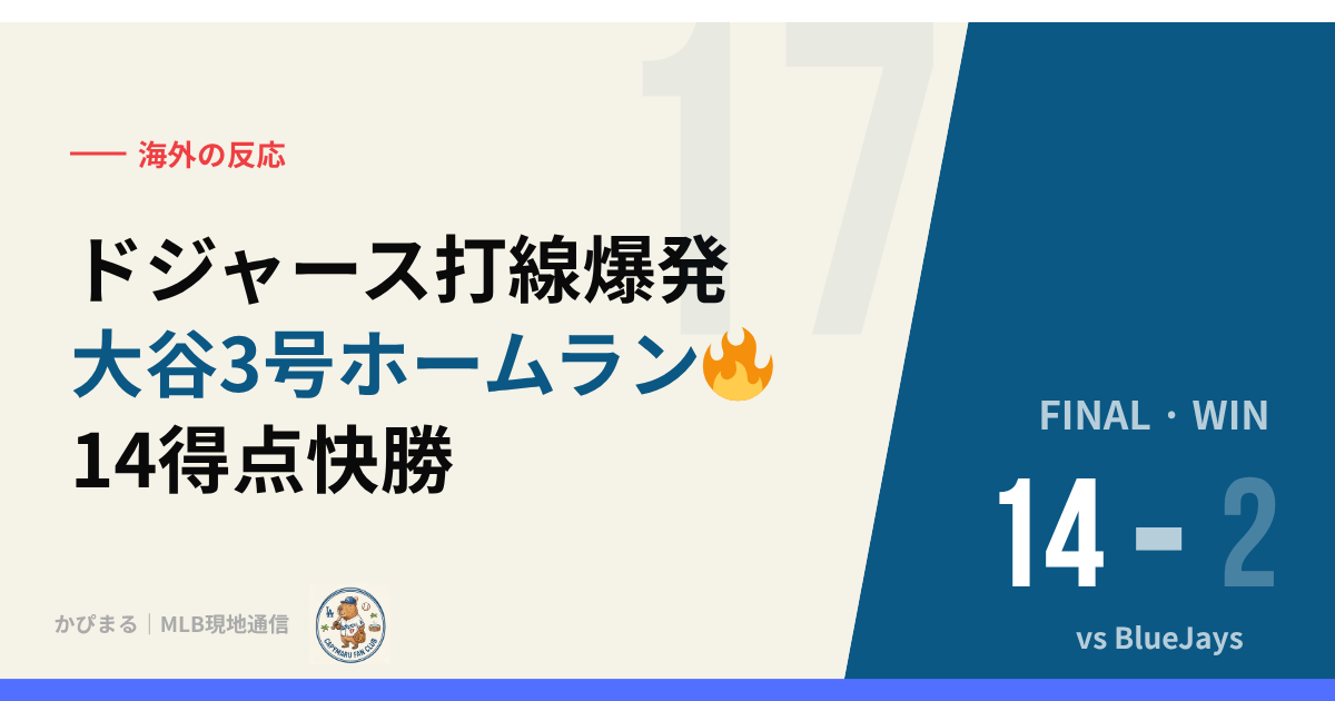 2026年4月6日、カナダ・トロントのロジャース・センター。ドジャースはシーズン序盤から絶好調の打線をブルージェイズ戦でも存分に発揮した。初回表、テオスカー・ヘルナンデスが今季2号となる2ランHR(102.2mph・371ft)を左翼スタンドへ叩き込み、いきなり2-0と試合の流れを掴む(WPA+18.2%・試合最大)。3回表にはフレディ・フリーマンが今季3号2ランHR(108.5mph・438ft)で追加点、6回表は大谷翔平が今季3号ソロHR(107.8mph・414ft)とアンディ・パヘスの2点二塁打で3点を積み上げる。そして最大の見せ場は7回——ダルトン・ラッシングが今季2号ソロHR(107.4mph・415ft)を放ち、続けてフリーマンのタイムリー二塁打、テオスカーの2点タイムリー安打で4点ビッグイニングを形成。さらに8回もラッシングが今季3号ソロHR(109.0mph・413ft)と2試合連続ではなく同一試合での連続アーチという離れ業を見せた。先発ロブレスキーは四球が4つと制球に課題を残したものの5回1失点で今季初勝利。最終スコア14-2の圧勝でトロント遠征の初戦を制した。
