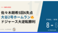 5回1失点(BB4)でシーズンERA 4.00。四球の多さは次回登板に向けた修正ポイントだが、要所での粘りを見せ打線の援護を生かした。後を受けたクライン(2回0ER)・エンリケス(1回0ER)が安定したブルペンワークでつないだ点も評価できる。