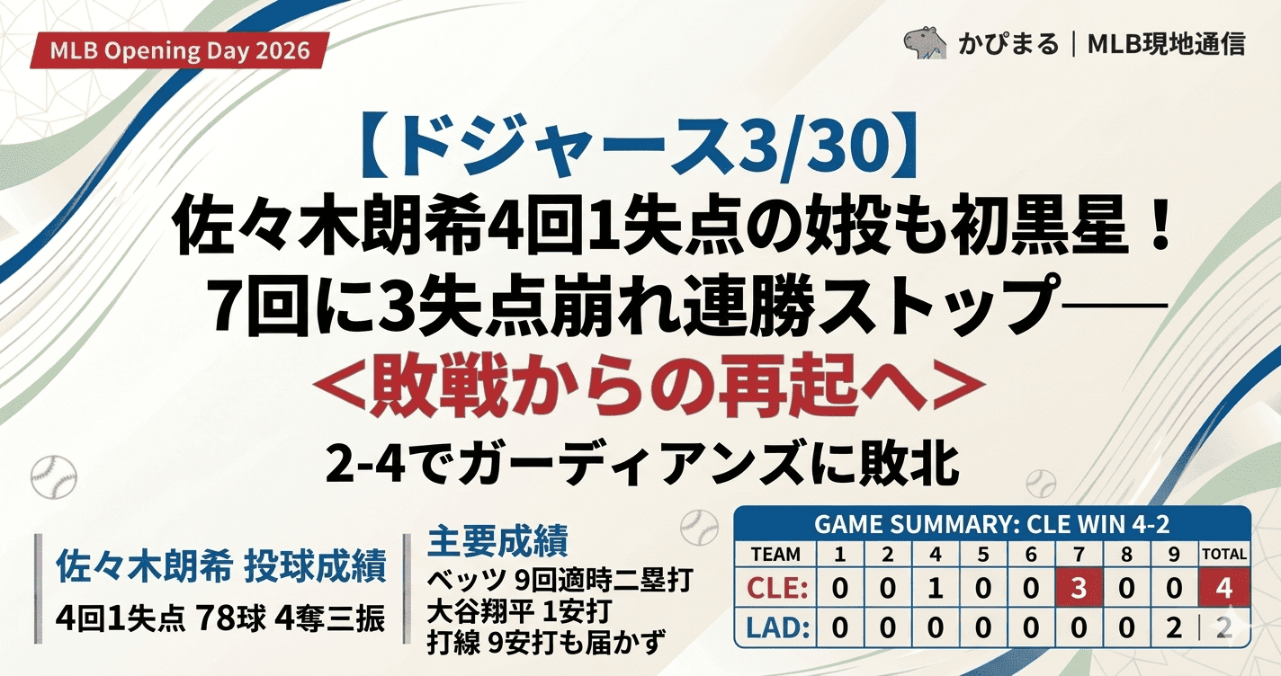 2026年3月30日、UNIQLO フィールド アット ドジャー・スタジアム。開幕4戦目、ドジャースの日本人3投手が登板予定の注目カードが幕を開けた。1戦目にマウンドに上がったのは、春季キャンプで揺れに揺れた佐々木朗希。最速99.5mphの直球を武器に4イニングを1失点で切り抜け、「令和の怪物」がレギュラーシーズン初登板を踏みしめた。しかし打線はガーディアンズ先発パーカー・メシックの前に6回無失点に封じられ、クリーンアップ陣が揃って沈黙。7回にロブレスキーが3点を失い試合の行方が決まった。9回裏のムーキー・ベッツ適時打などで2点を返したが、反撃も届かず2-4で今季初黒星を喫した。