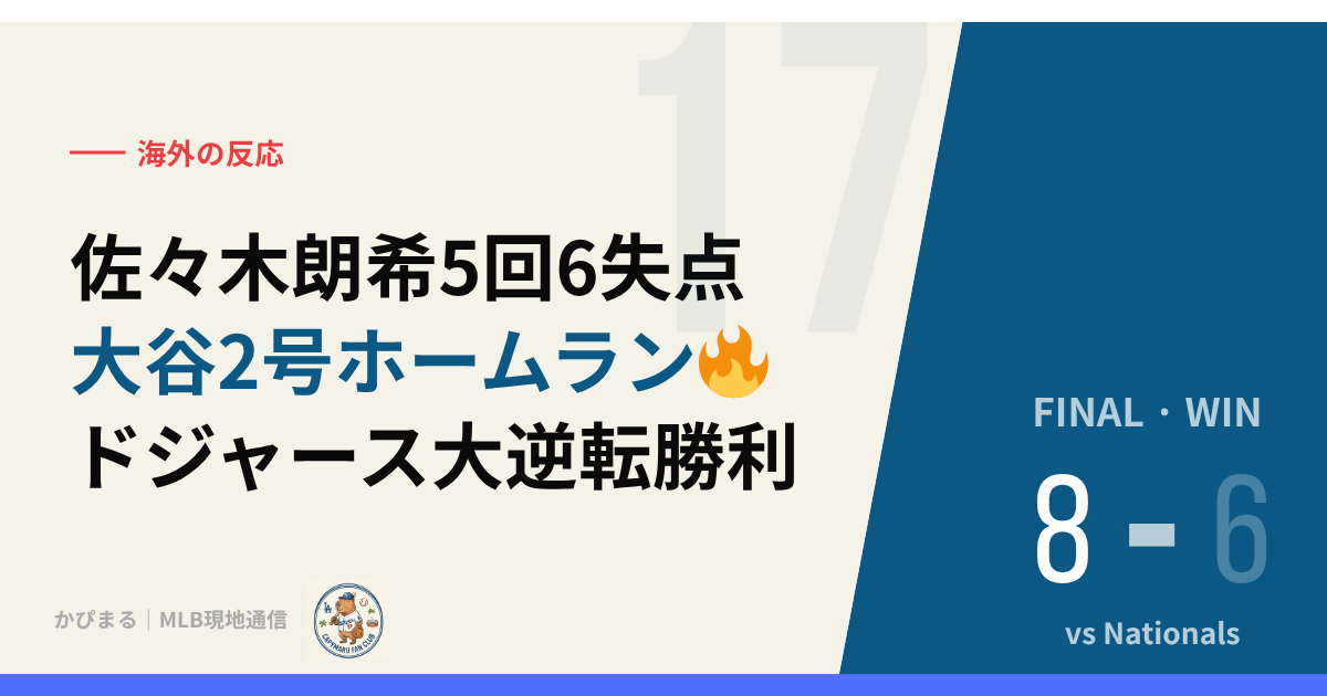 2026年4月5日、ナショナルズ・パーク。ワシントンD.C.の春空のもと、ドジャースは試合序盤から苦境に立たされた。先発・佐々木朗希が制球を乱し、3・4回に計6失点。4回終了時点で1-6と5点差をつけられ、このまま完敗かと思われた。しかし、これがロサンゼルスの底力だった。6回にダルトン・ラッシングが今季1号となる2ランHR(103.0mph・375ft)で反撃を開始すると、勝負を決めたのは8回表。連打と四球で無死満塁のチャンスを作り、エスピナルの2点タイムリー、タッカーの内野ゴロで同点、大谷翔平の犠牲フライで逆転。さらに9回、テオスカー・ヘルナンデスが今季1号ソロHR(103.0mph・414ft)でダメ押し。エドウィン・ディアスが締め括り、ドジャースが8-6で劇的逆転勝利を飾った。