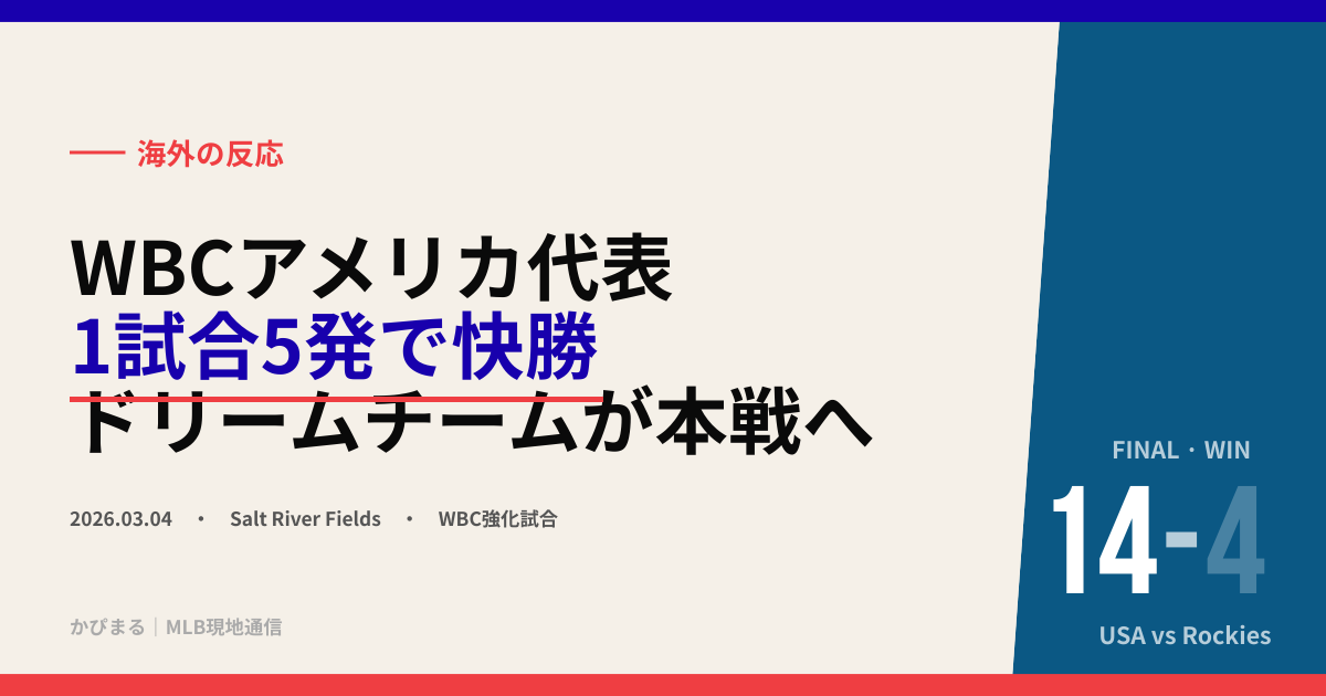 WBC2026開幕2日前、Team USAはスプリングトレーニング中のコロラド・ロッキーズと強化試合を実施。 アーロン・ジャッジが初回に453ft・EV115.9mphの超特大弾で口火を切り、前日のジャイアンツ戦(15-1)に続く2試合連続の圧勝。 序盤はロッキーズに4-3と肉薄される予想外の展開もあったが、後半に爆発して合計5本塁打・14得点。 クレイトン・カーショウ(引退後の特別参加)が登板するサプライズもあり、試合終了後SNSと海外メディアは大盛り上がりとなった。
