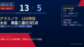 | チーム | 1 | 2 | 3 | 4 | 5 | 6 | 7 | 8 | 9 | R | H | E |