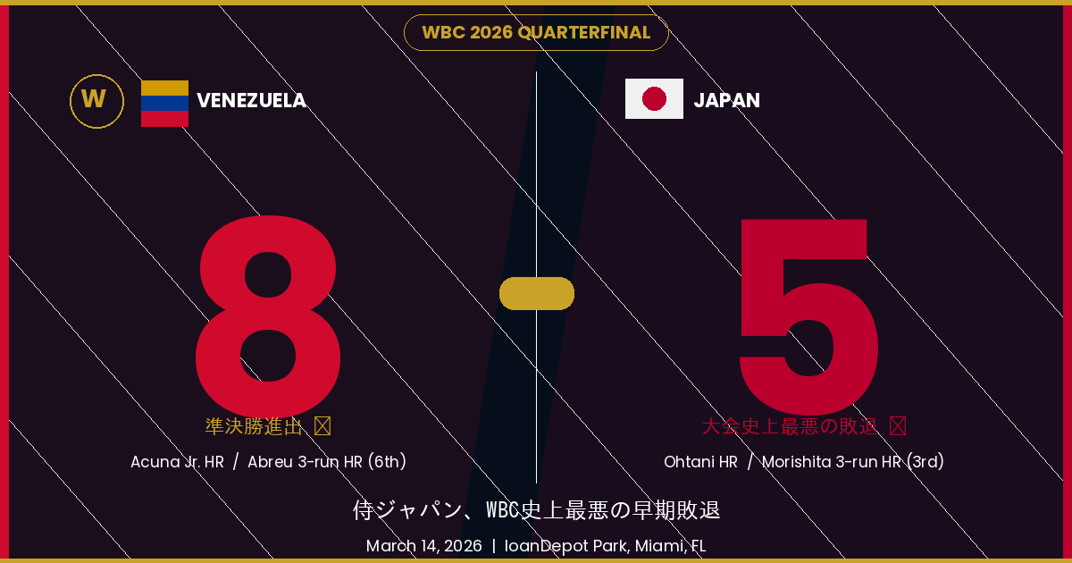 日本代表の大会最悪成績という衝撃的な結果と、ベネズエラ史上最高成績という歓喜が同時に生まれたこの夜は、WBC史上最も記憶に残る一夜のひとつとして語り継がれるだろう。次戦ベネズエラはイタリアと対戦する。